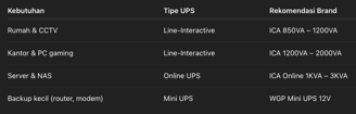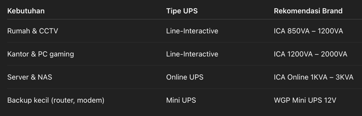 Memilih UPS yang tepat bukan soal merek saja, tapi soal kebutuhan dan kondisi pemakaian. Dengan mengenali jenis UPS, menghitung daya yang dibutuhkan, dan memilih dari brand yang terpercaya, kamu bisa melindungi perangkat elektronik dari risiko mati listrik dan tegangan tidak stabil.